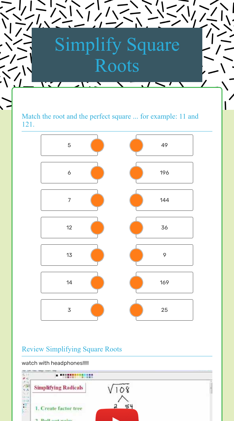 Square Root Worksheets - K12 Workbook *Click on Open button to open and print to worksheet. 1. Math 6 NOTES (6.2) Name: 2. Square Roots Worksheet 3. Square Roots Date Period - 4. Finding Square Root Easy 5. 1=1 36 =6 4=2 49 =7 6. Squares and Square Roots (A) - 7. 1-Simplifying Square Roots - 8. SQUARES AND SQUARE ROOTS -